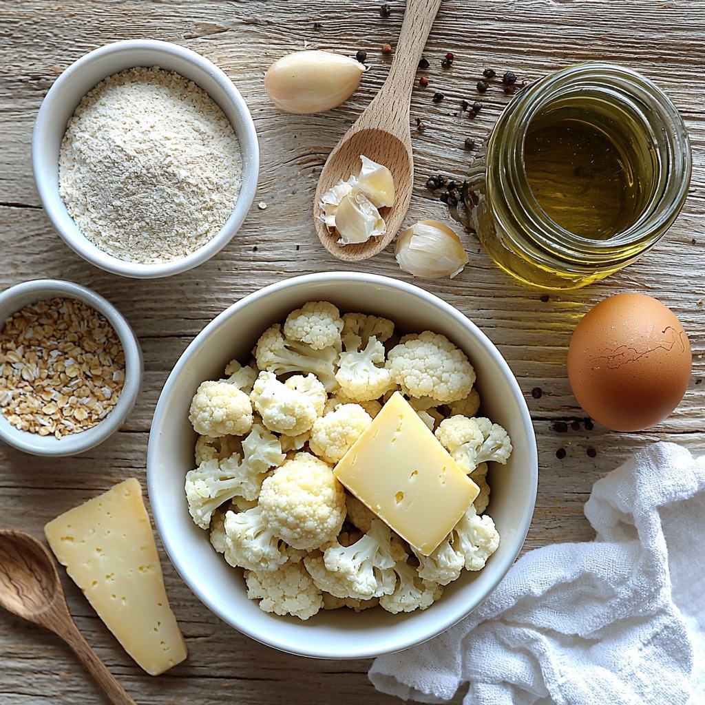 - Combine Ingredients: Add the steamed and finely chopped cauliflower, garlic granules, oat flour, mild cheddar cheese, egg, and black pepper to a large mixing bowl. Using a spoon, stir all ingredients thoroughly until fully combined into a consistent mixture.