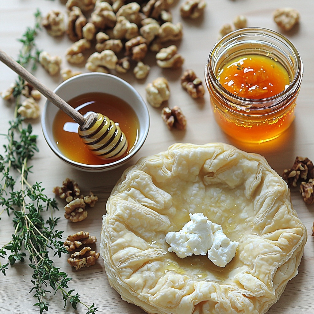 - Garnish and Serve: Remove the tarts from the oven and immediately sprinkle fresh thyme leaves over each tart. Drizzle with hot honey to add a subtle spicy sweetness that complements the tangy goat cheese and sweet jam. Allow the tarts to cool for a few minutes before serving to let the flavors meld and to avoid burns.