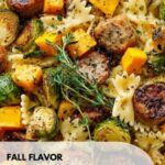 This Autumn Sausage Pasta with Roasted Butternut Squash and Brussels Sprouts is a hearty, flavorful dish perfect for cozy fall dinners. Tender roasted butternut squash and crispy Brussels sprouts combine beautifully with smoky sausage and al dente bow tie pasta, all tossed in a rich garlic butter sauce accented by smoked paprika and fresh thyme. This vibrant, comforting meal is easy to prepare and delivers a perfect balance of savory, sweet, and smoky flavors.