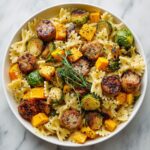 This Autumn Sausage Pasta with Roasted Butternut Squash and Brussels Sprouts is a hearty, flavorful dish perfect for cozy fall dinners. Tender roasted butternut squash and crispy Brussels sprouts combine beautifully with smoky sausage and al dente bow tie pasta, all tossed in a rich garlic butter sauce accented by smoked paprika and fresh thyme. This vibrant, comforting meal is easy to prepare and delivers a perfect balance of savory, sweet, and smoky flavors.