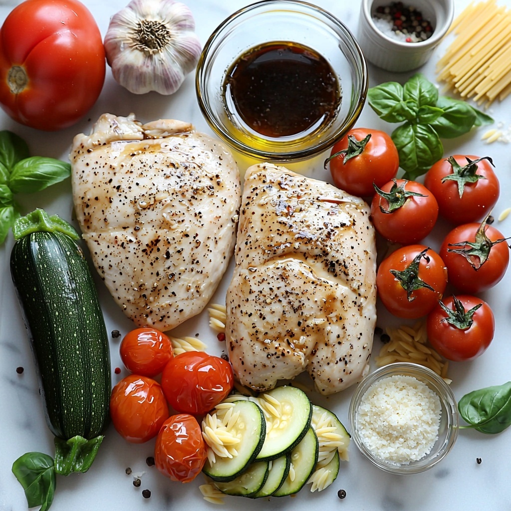 Every ingredient in this Balsamic Chicken & Veggie Orzo Recipe plays a crucial role in creating a harmonious blend of taste, texture, and color. From the juicy chicken marinated in balsamic goodness to the fresh basil that finishes the dish with a pop of green, these essentials come together beautifully without any fuss.