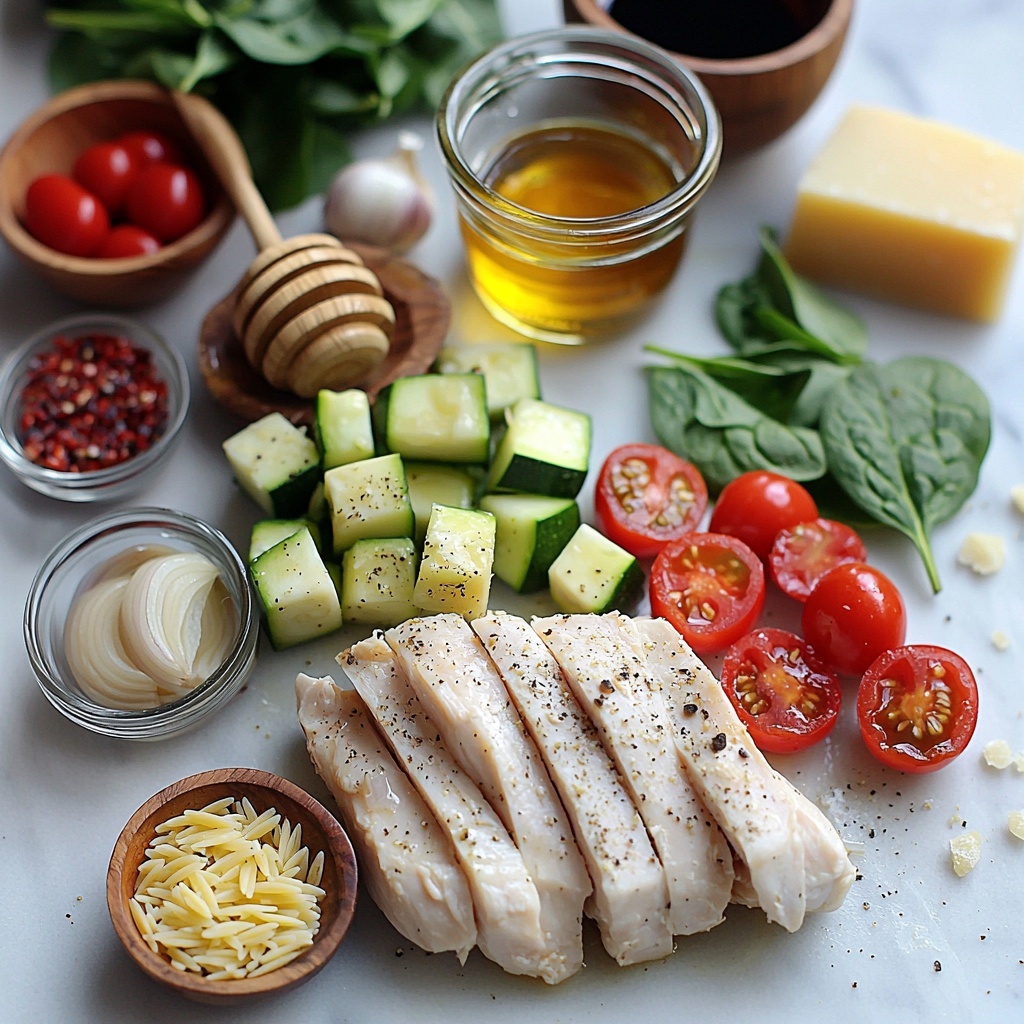 Gathering the ingredients for the Balsamic Chicken & Veggie Orzo Recipe is straightforward and fun, featuring simple staples that combine to make something truly spectacular. Each component plays an essential role, whether adding vibrant color, a juicy sweetness, or a satisfying texture.