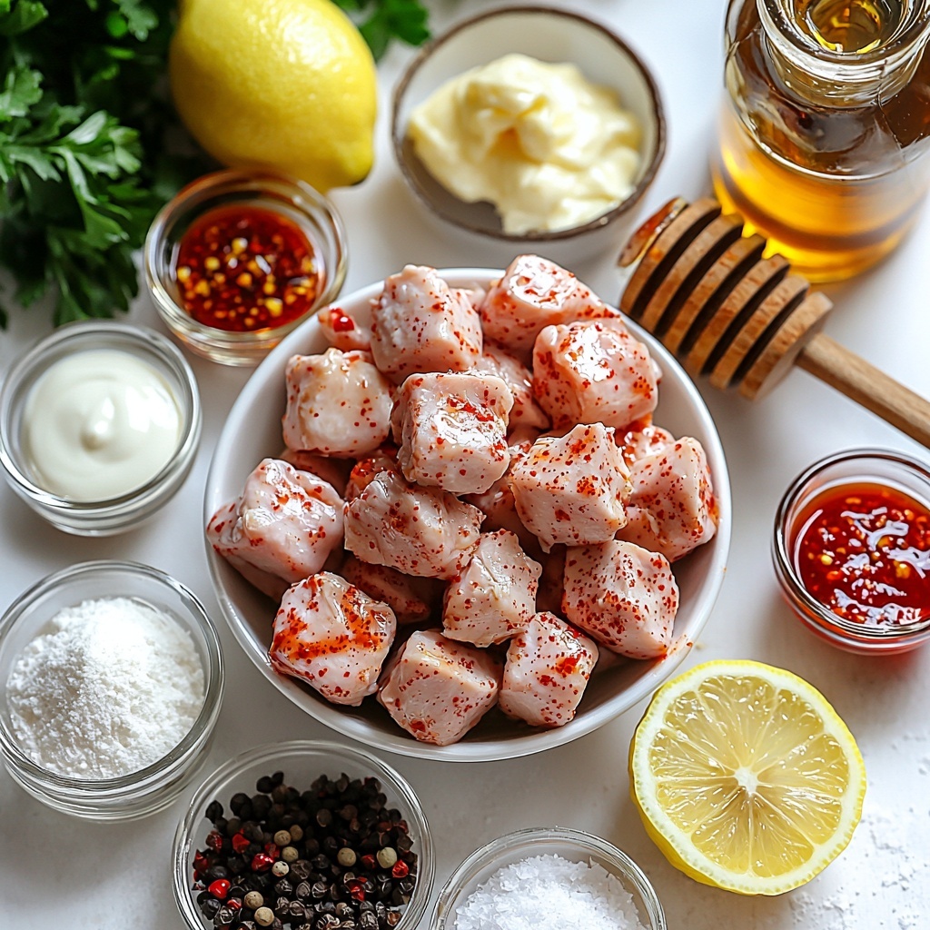 Start by combining all the sauce ingredients — mayonnaise, chili-garlic sauce, honey, sriracha, paprika, lemon juice, salt, and black pepper — in a medium bowl. Whisk everything together until you have a smooth, vibrant sauce. Set this aside, as it’s going to be the flavor bomb that dresses your crispy chicken bites.