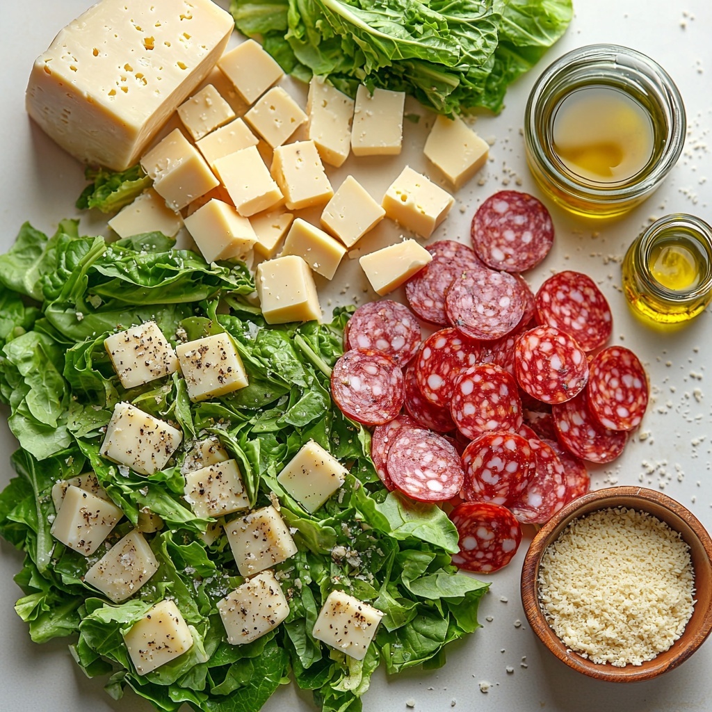 The first step is to get everything chopped and ready to go—romaine lettuce, salami, cheese, red onion, and pepperoncini. Having all the components prepped ensures smooth assembly later and maximizes freshness.