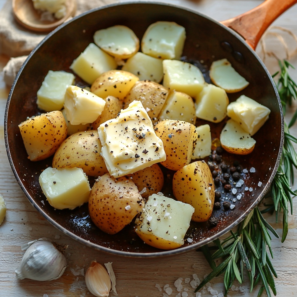 - Prepare Flavored Butter: While potatoes boil, melt the unsalted butter in a small skillet over medium heat. Add crushed garlic, ground black pepper, steak seasoning, kosher salt, and chopped fresh rosemary. Stir occasionally until butter melts and ingredients release their flavors.