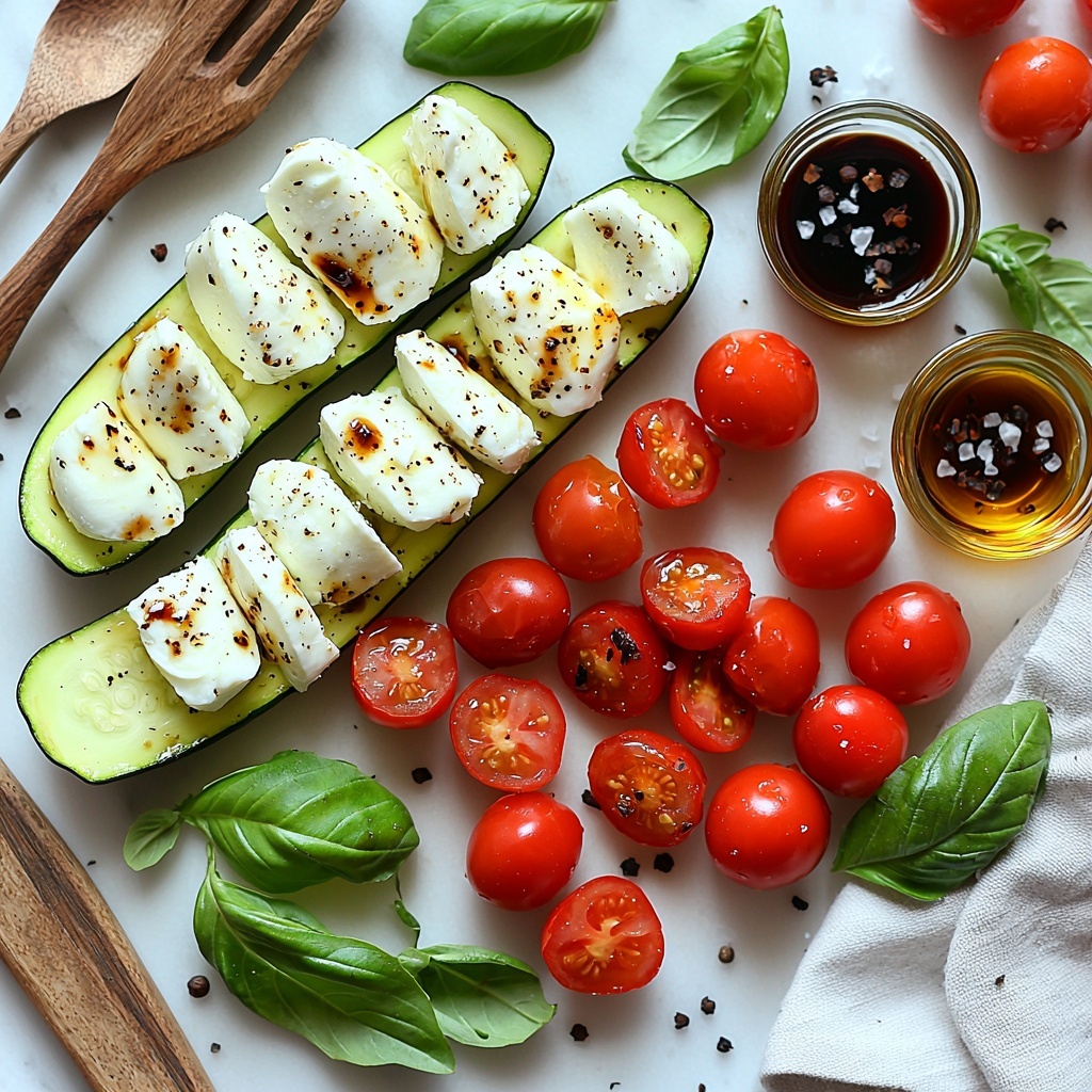 These ingredients are simple yet essential to capturing the true spirit of this Caprese Stuffed Zucchini Boats Recipe. Each component plays a vital role, from the fresh rasp of the zucchini to the melty mozzarella that adds a creamy touch, and the bright basil and balsamic glaze that elevate every bite.