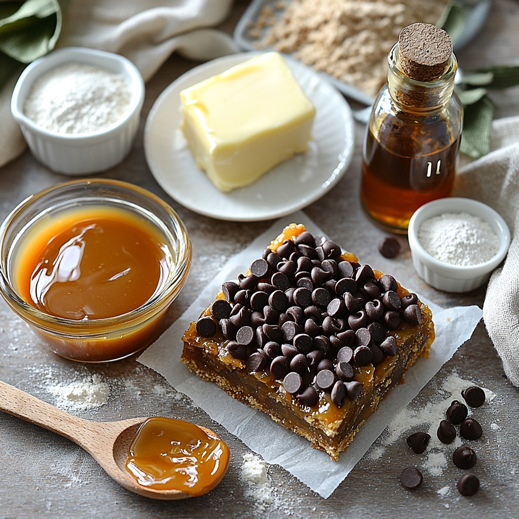 The magic of these Caramel Crush Bars lies in their simple yet thoughtfully chosen ingredients. Each one plays a crucial role: the butter brings richness and tenderness, brown sugar adds warmth and depth, flour forms the sturdy but soft structure, while the caramel sauce and chocolate chips create that irresistible gooey and indulgent finish.