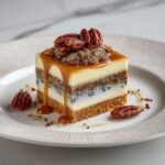 Because this dessert is best enjoyed chilled, skip reheating. Instead, allow frozen pieces to thaw naturally in the refrigerator to maintain their creamy layers and crisp pecan topping.