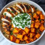 - Assemble the Bowl: Place a serving of cooked brown rice at the bottom of each bowl. Top with roasted sweet potatoes and seared chicken. Drizzle the prepared Greek yogurt sauce over the top to finish the dish. Serve warm and enjoy!