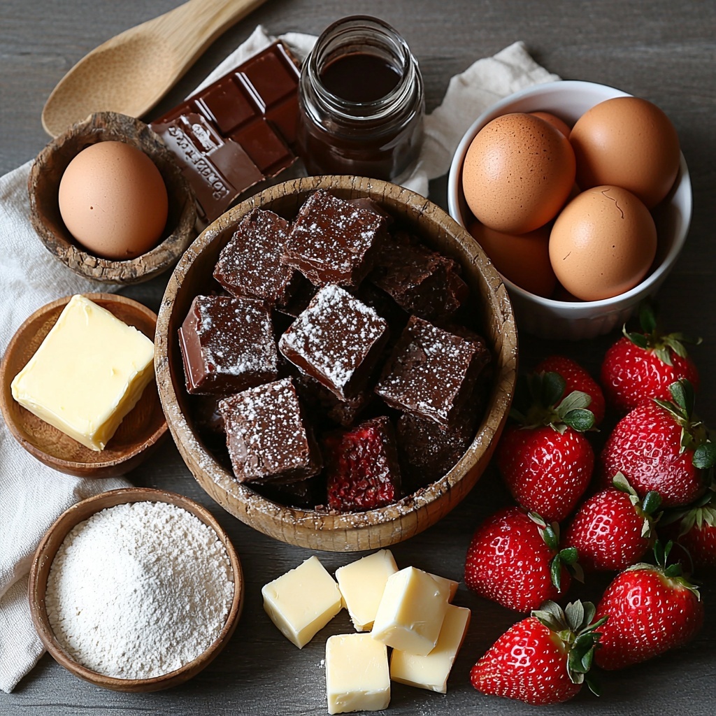 This recipe relies on simple, everyday ingredients that each play a crucial role in creating those perfectly balanced brownies topped with luscious, chocolate-dipped strawberries. The butter and sugar work harmoniously to deliver a tender crumb and sweet base, while the cocoa and chocolate chips deepen the chocolate flavor. Then, juicy fresh strawberries take the dessert to another level with their vibrant color and natural sweetness.