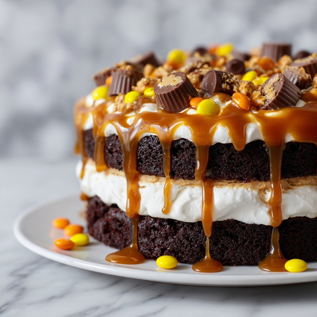 To serve the cake beautifully, add additional chopped Reese’s Cups or a few more Reese’s Pieces scattered on top right before serving. These decorations offer visual appeal and a delightful crunch that contrasts the soft cake perfectly. You can even add a dollop of whipped cream or a sprinkle of cocoa powder for an elegant finish.