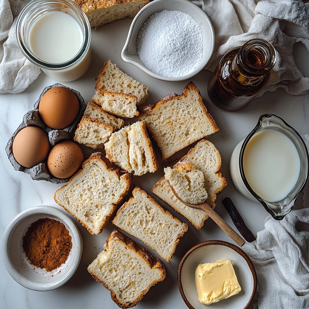 The magic of this Classic Bread Pudding with Vanilla Sauce Recipe lies in the simplicity of its ingredients. Each one plays a crucial role in building its delightful textures, warm flavors, and that golden color everyone loves. From the comforting cinnamon to the velvety milk and eggs creating the custard, no ingredient is just filler — they all work in perfect harmony.