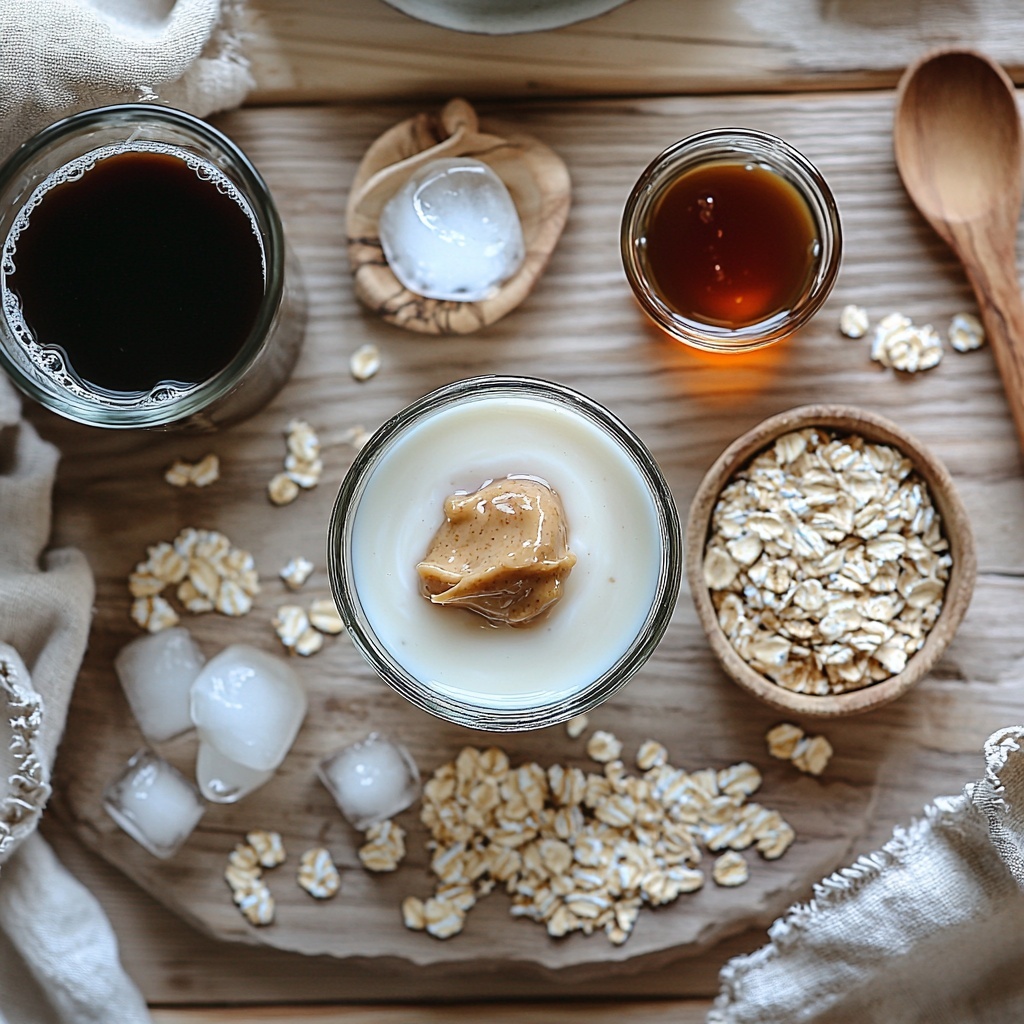 Start by assembling all those simple, delicious ingredients. Place the milk, brewed coffee, yogurt, oats, almond butter, vanilla extract, and maple syrup into your blender. Adding them all at once ensures every element blends together for a smooth, consistent flavor.