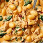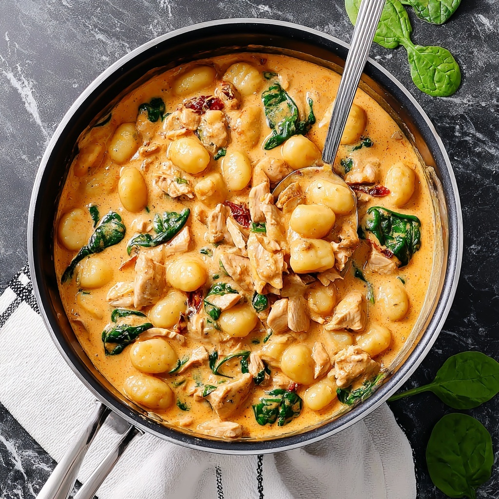 A rich and comforting Creamy Chicken and Gnocchi dish featuring tender chicken pieces simmered in a luscious sauce made with chicken stock, heavy cream, garlic, and Parmesan cheese, complemented by flavorful sun-dried tomatoes and fresh baby spinach. Perfect for a cozy weeknight dinner, this skillet recipe comes together quickly and delivers a satisfying blend of creamy textures and savory flavors.