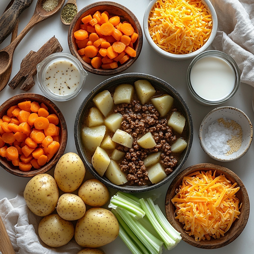 2. Add ingredients to the crockpot: Transfer the cooked ground beef into the crockpot. Add the diced russet potatoes, carrots, celery, and chopped onion.