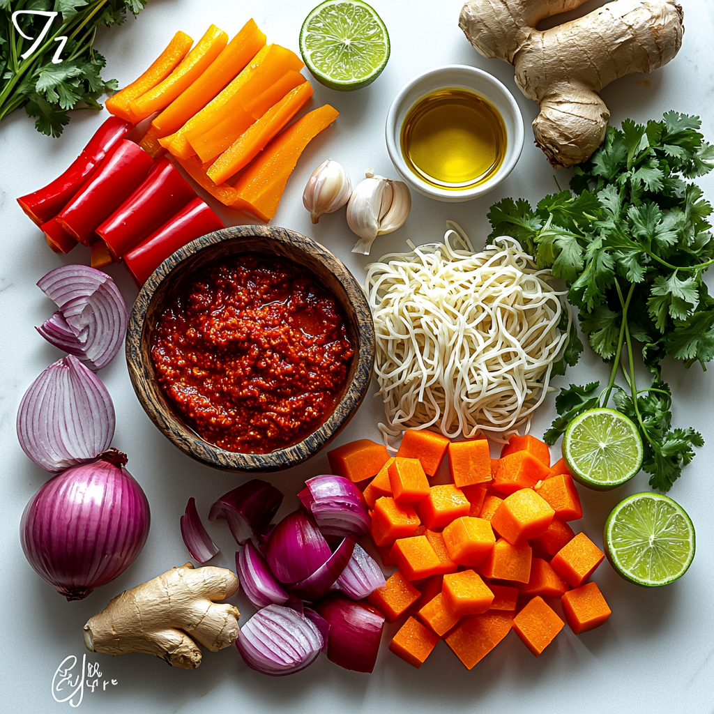 The ingredients for this soup are wonderfully simple, yet each one plays a crucial role in creating the perfect balance of taste, texture, and color. From the fragrant ginger and garlic to the creamy coconut milk and fresh lime juice, these essentials come together to make every spoonful unforgettable.