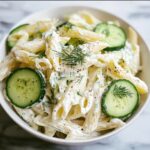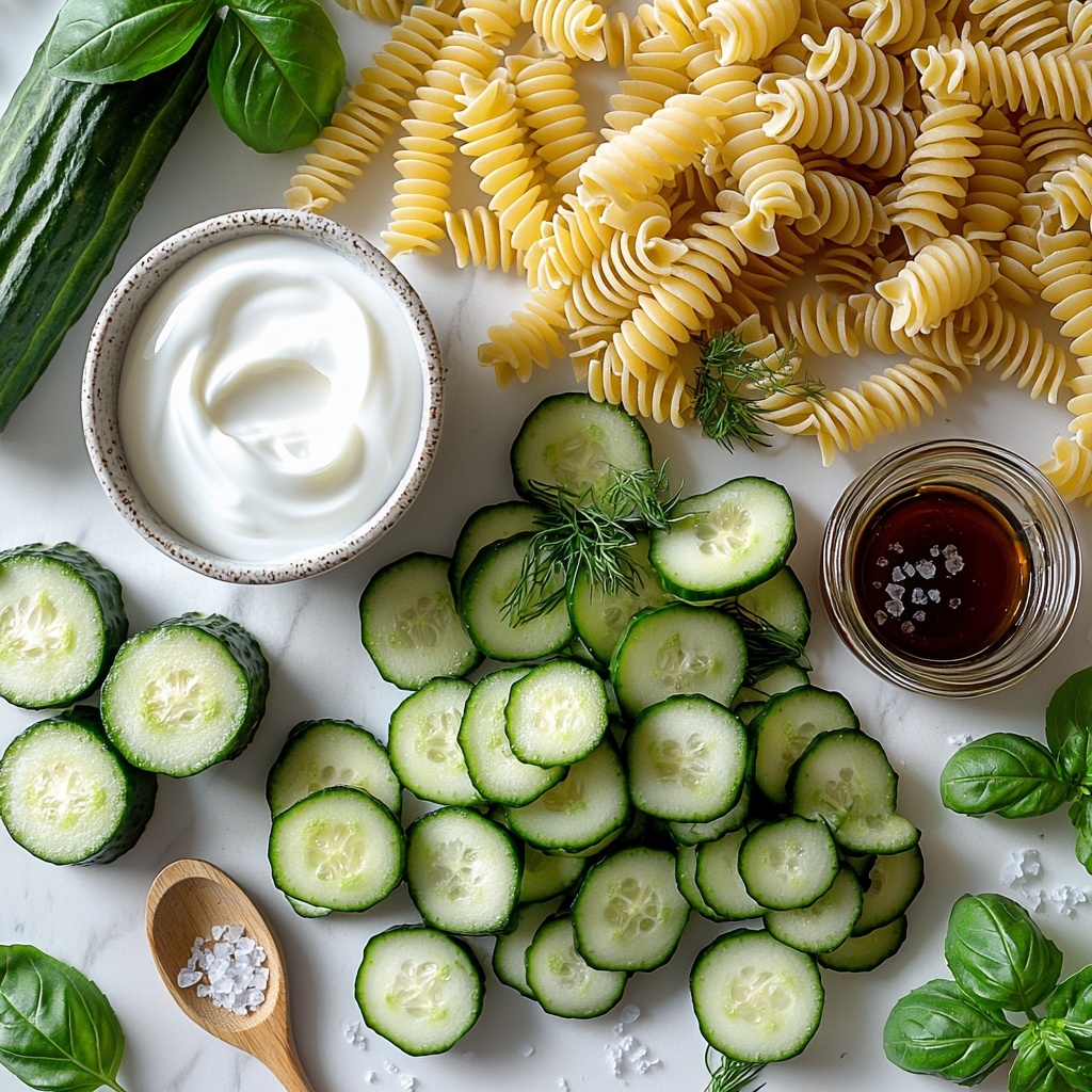 A refreshing and healthy cucumber pasta salad perfect for summer gatherings. This dish combines al dente fusilli or penne pasta with crisp English cucumbers, mellow onions, and a creamy dressing made from Greek yogurt, light mayonnaise, vinegar, and fresh herbs for a light yet flavorful salad.