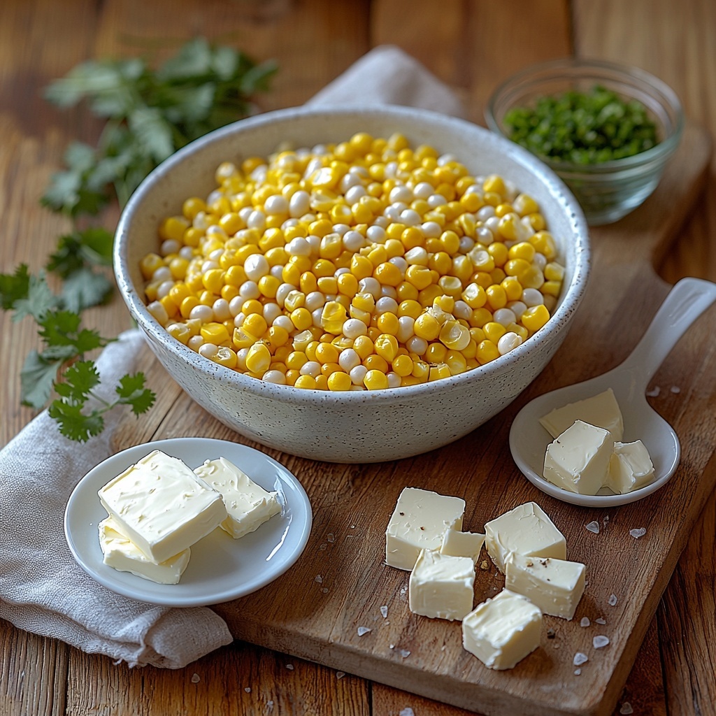 Start by placing the drained white shoepeg corn and the can of diced green chilies in your slow cooker. These two create the flavorful foundation that’s bursting with both sweetness and a mellow kick from the chilies. Layer the cubed butter and cream cheese evenly on top; these will melt down and transform the dish into a dreamily creamy comfort food.