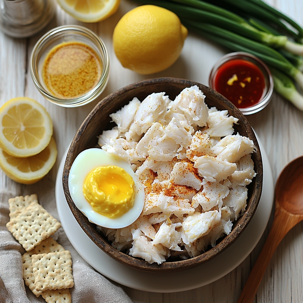 Start by mixing mayonnaise, egg, Dijon mustard, hot sauce, lemon juice, Old Bay seasoning, and thinly sliced green onions in a bowl. This blend forms the flavorful and smooth base that will marry perfectly with the crab meat.