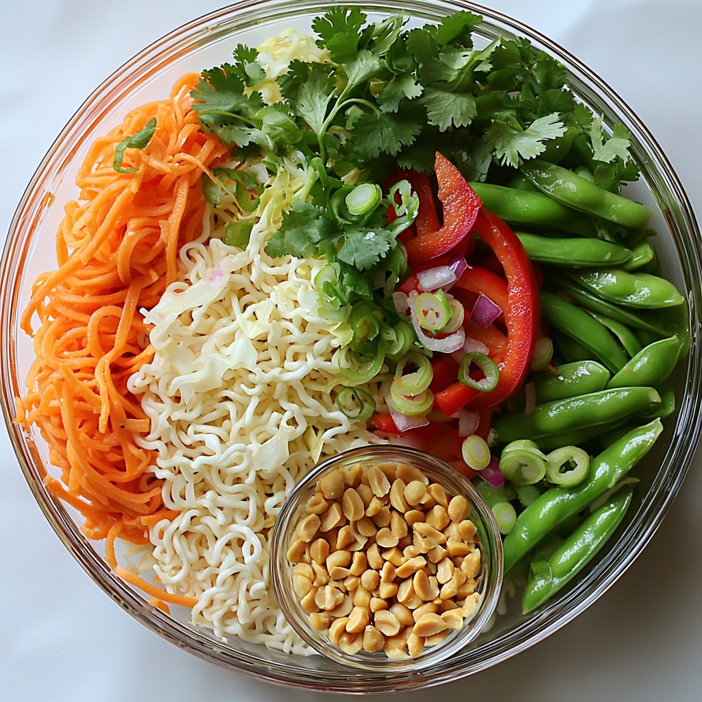2. Combine Vegetables: In a large mixing bowl, combine the shredded carrots, sliced red bell pepper, shredded cabbage, chopped green onions, snap peas, and cilantro.