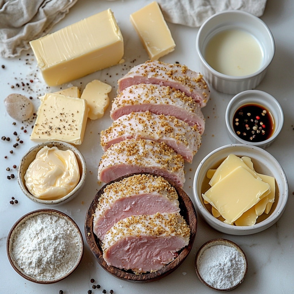 Start by preheating your oven to 350 degrees F and lightly greasing a 9×13-inch baking dish with cooking spray to prevent sticking. While the oven heats, prepare your breadcrumb topping by combining fresh breadcrumbs and melted butter in a bowl—this blend will add that irresistible crunch you want on top. Next, lay the chicken cutlets in a single layer inside the greased dish. Then, lovingly layer two slices of honey ham over each chicken piece, making sure to cover them completely. Top the ham with two slices of Swiss cheese, overlapping them to create a blanket of melty goodness. Repeat this assembly for each chicken cutlet, finishing with an even sprinkle of the buttery breadcrumbs on top. This will give your Chicken Cordon Bleu that perfect golden crust.
