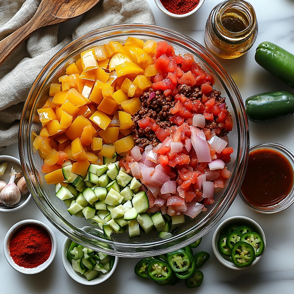 - Cook vegetables: Add diced bell pepper and zucchini to the browned meat. Cook for 4–5 minutes until the vegetables soften slightly, stirring occasionally.