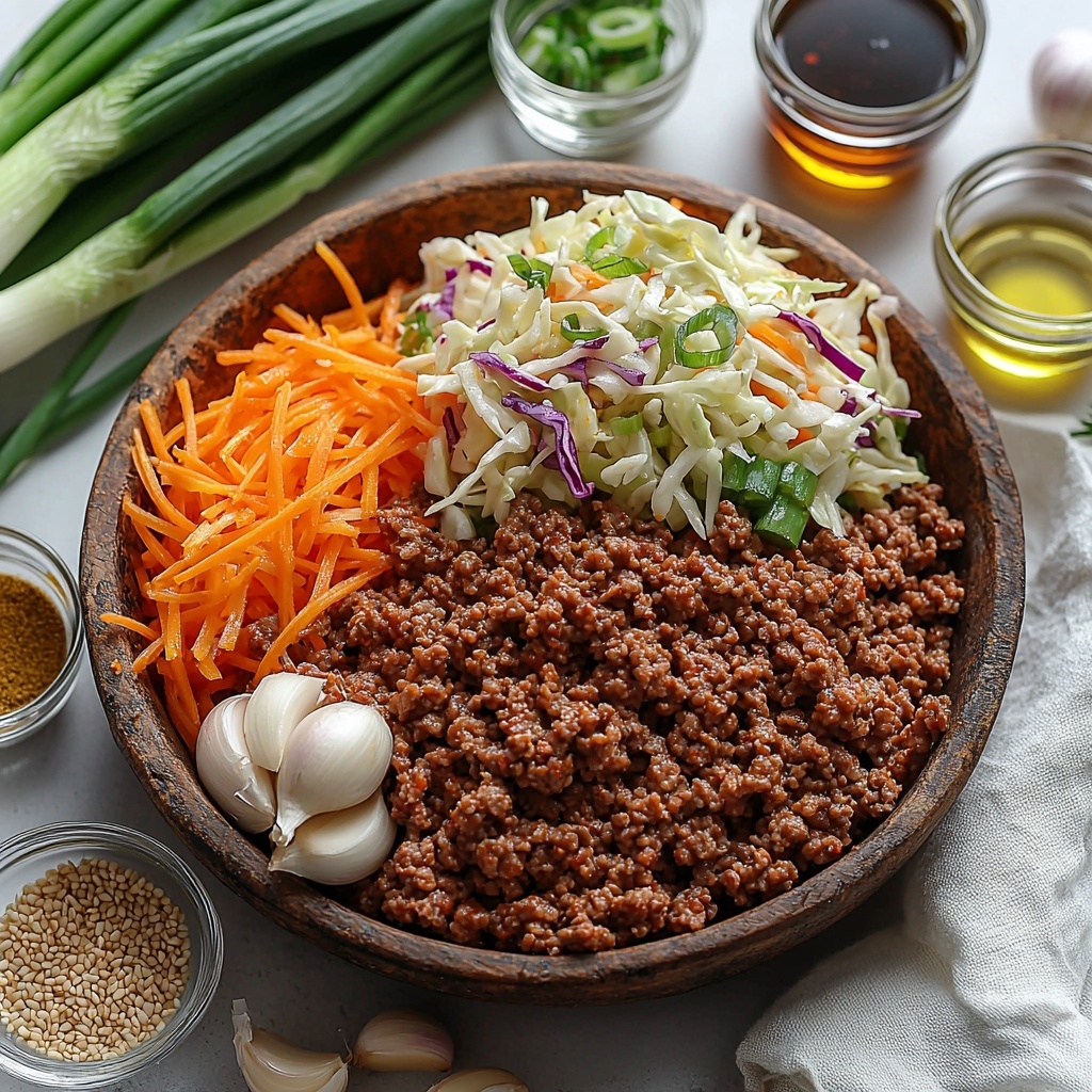 This Egg Roll in a Bowl Recipe calls for a handful of simple, pantry-friendly ingredients that each play an essential role in building layers of texture and flavor. From the hearty ground beef to the crispy coleslaw mix, every item brings something special that elevates the dish.
