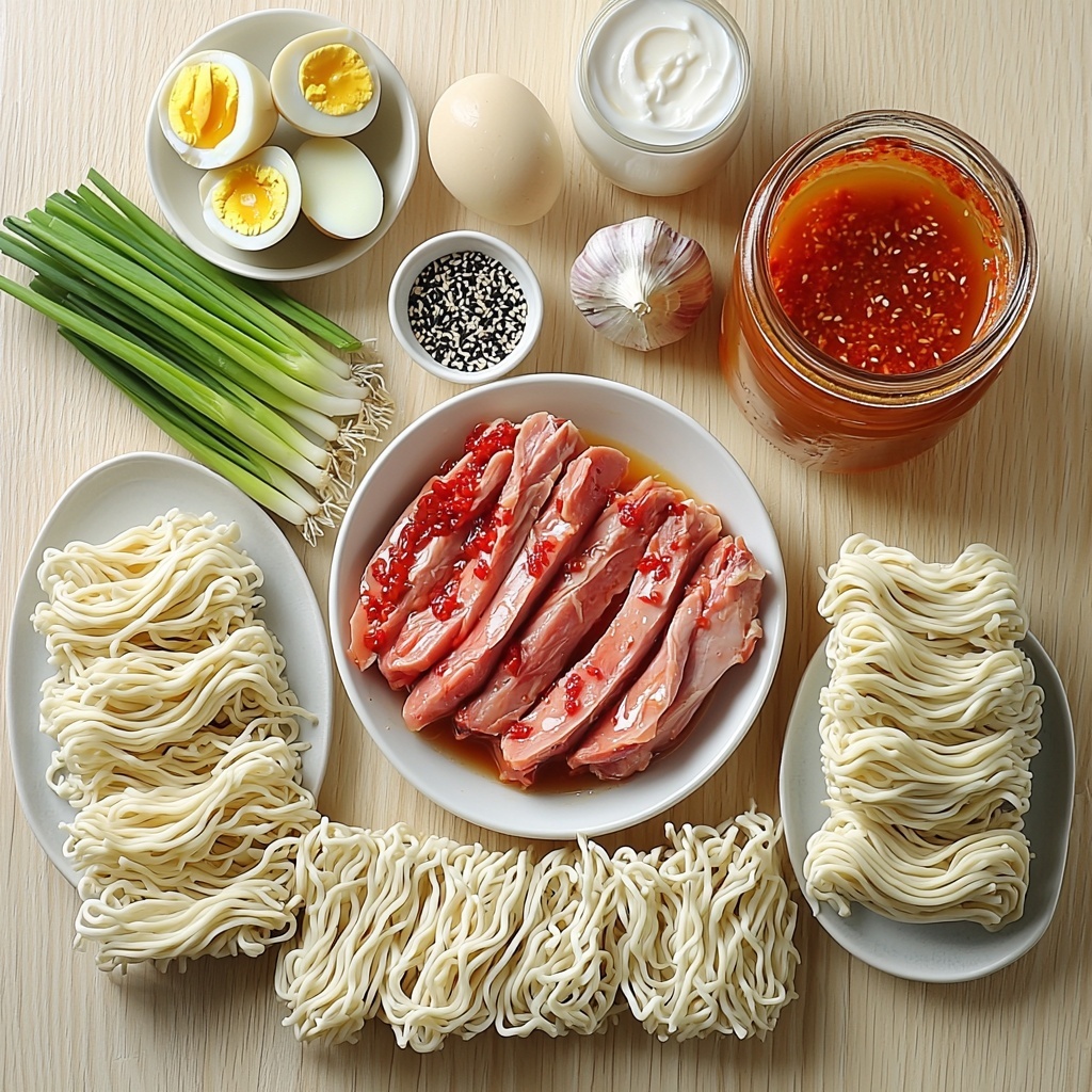 These ingredients are straightforward but pack incredible punch, each bringing something essential to your Fiery Chicken Ramen Garlic Recipe. From the succulent chicken thighs to the creamy coconut milk, every element works together to create a harmonious bowl of flavorful indulgence.