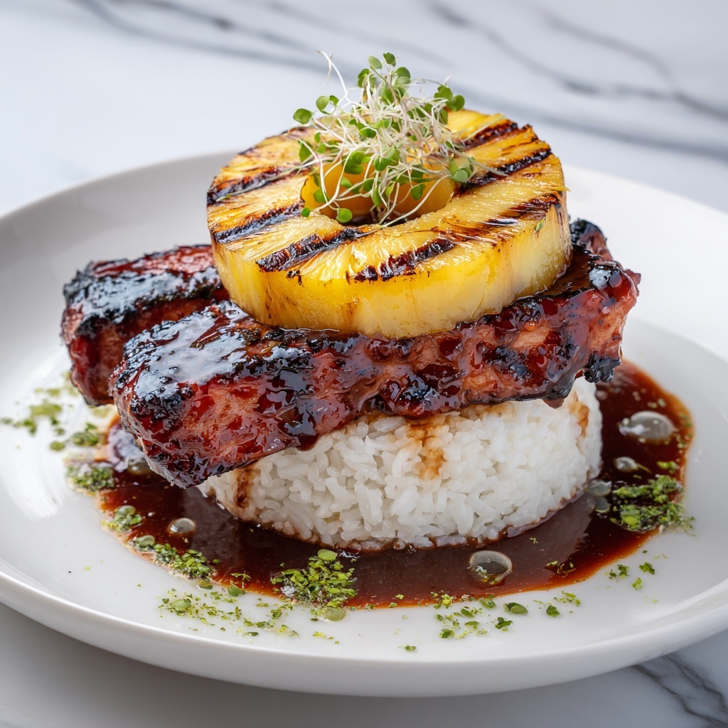 This Hawaiian Huli Huli Chicken Stack is a vibrant and flavorful dish featuring tender marinated chicken thighs glazed with a sweet and tangy pineapple soy sauce, layered atop sticky rice and topped with caramelized grilled pineapple slices. Perfect for a tropical-inspired dinner that combines savory, sweet, and umami flavors in an attractive stacked presentation.