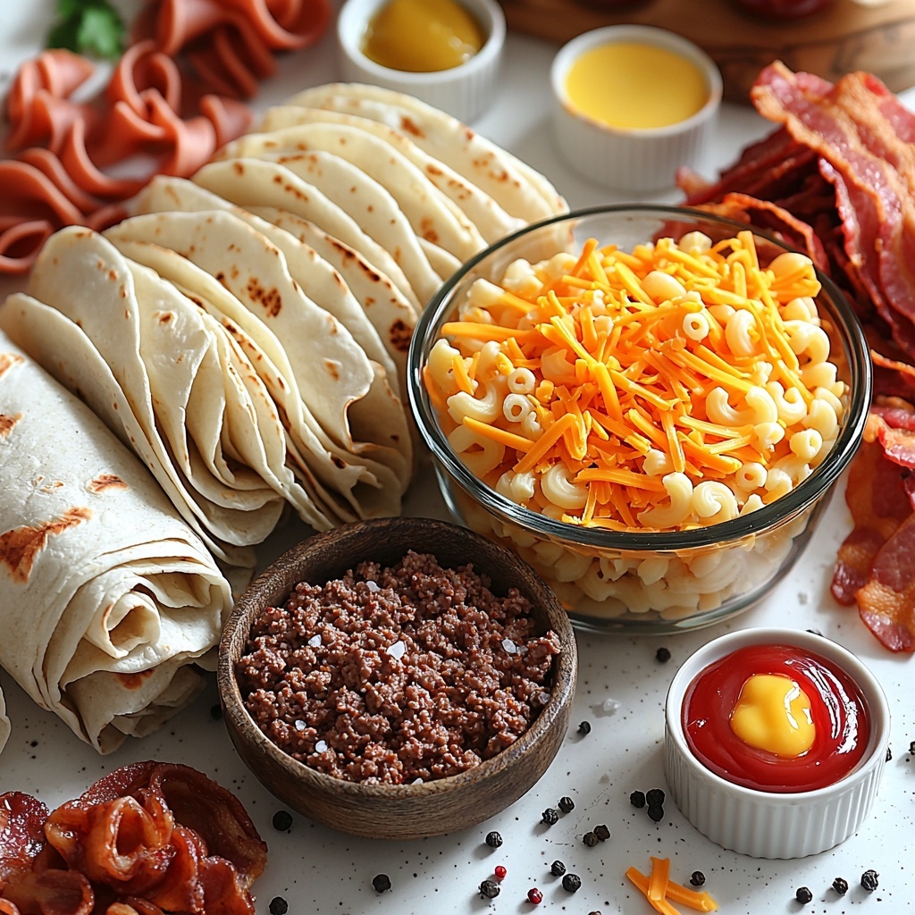 These Mac Cheese Bacon Burger Rolls are a delicious fusion of a cheeseburger and mac and cheese, all wrapped in a warm flour tortilla and pan-fried to golden perfection. Filled with seasoned ground beef, creamy macaroni and cheese, crispy bacon, and a touch of ketchup and mustard, they make for a perfect savory snack or meal.