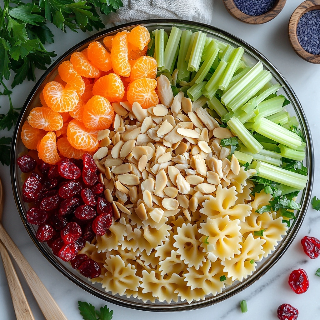 Next, gently fold in mandarin orange segments, thinly sliced red bell pepper, chopped celery, green onions, sliced almonds, and dried cranberries. This colorful medley creates the perfect blend of textures—from juicy to crunchy—and layers of flavor that keep every bite interesting.