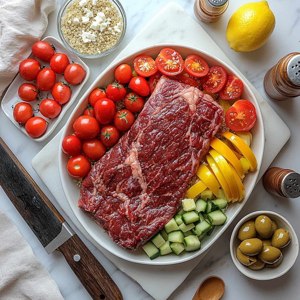 In a large mixing bowl, combine the cooked quinoa, fresh vegetables, olives, and crumbled feta cheese. Drizzle with the olive oil and lemon juice, then toss gently to marry all those Mediterranean flavors. Finish by slicing your rested steak thinly and arranging it beautifully on top for an inviting presentation that’s as tasty as it looks.