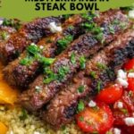 A vibrant and healthy Mediterranean Steak Bowl featuring grilled sirloin or flank steak served over fluffy quinoa, mixed with fresh vegetables, tangy feta cheese, and a zesty lemon-olive oil dressing. Perfect for a nutritious and satisfying meal packed with Mediterranean flavors.