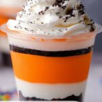 These No-Bake Halloween Cheesecake Cups are a festive and easy dessert perfect for spooky celebrations. Layers of crushed Oreo cookies, creamy orange and white cheesecake filling, and fluffy Cool Whip come together in individual cups without any baking required. The colorful layers are finished with Halloween-themed sprinkles and candy for a fun party treat.