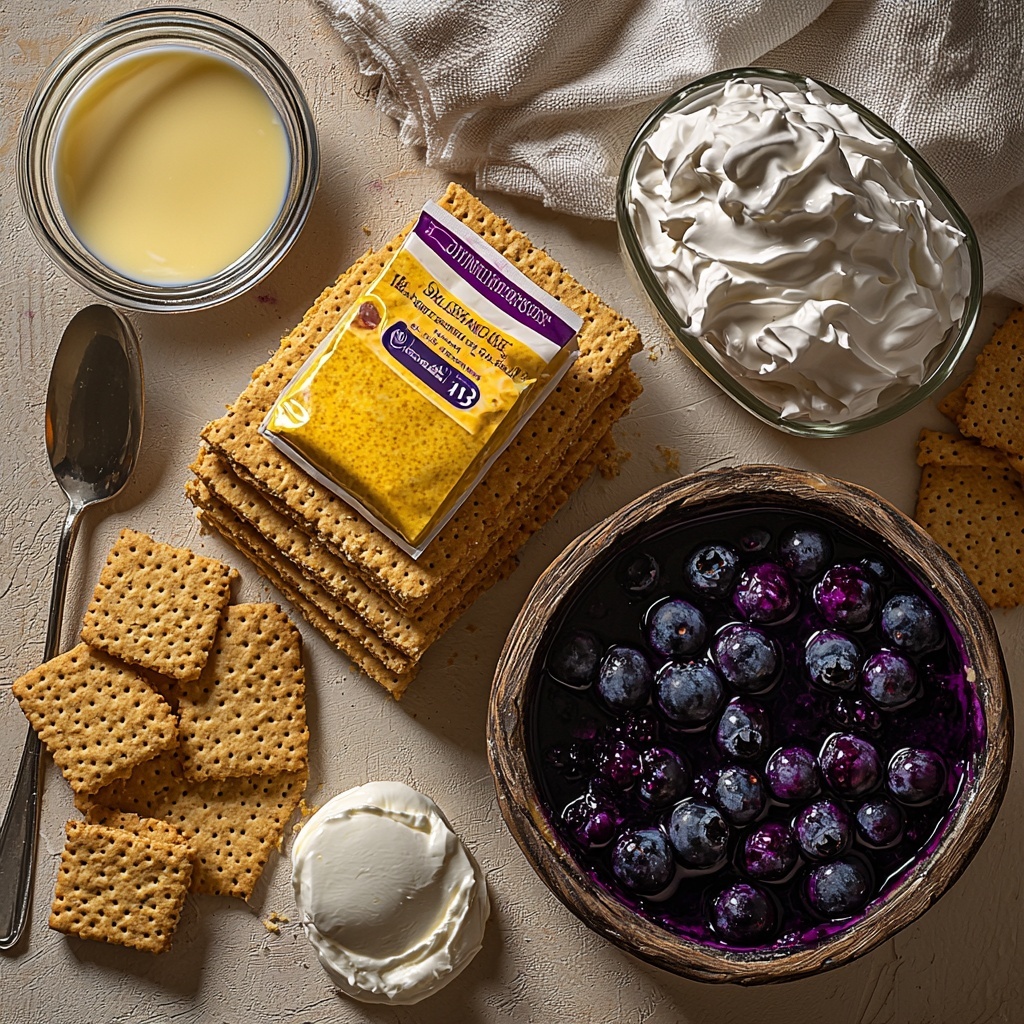 The magic of this No-Bake Lemon Blueberry Dessert Recipe is in its simplicity. Each ingredient plays a vital role: from the buttery crunch of graham crackers creating the perfect base, to the silky cream cheese blending with tangy lemon pudding for that dreamy texture, and finally the juicy burst of blueberries crowned with pillowy Cool Whip. Here’s what you’ll need to bring it all together.