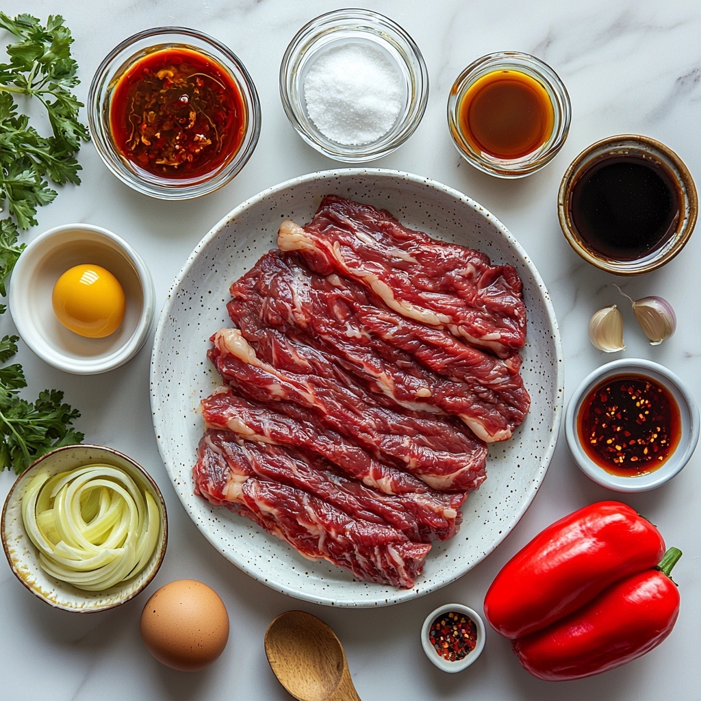 Start by slicing your skirt or flank steak against the grain into thin, ¼ inch strips. This ensures tenderness in every bite. Toss these beef strips in a medium bowl with the beaten egg and a teaspoon of cornstarch, letting them marinate for 30 minutes to an hour. This simple mixture helps tenderize the meat and sets up the crispy, golden crust you’re craving.