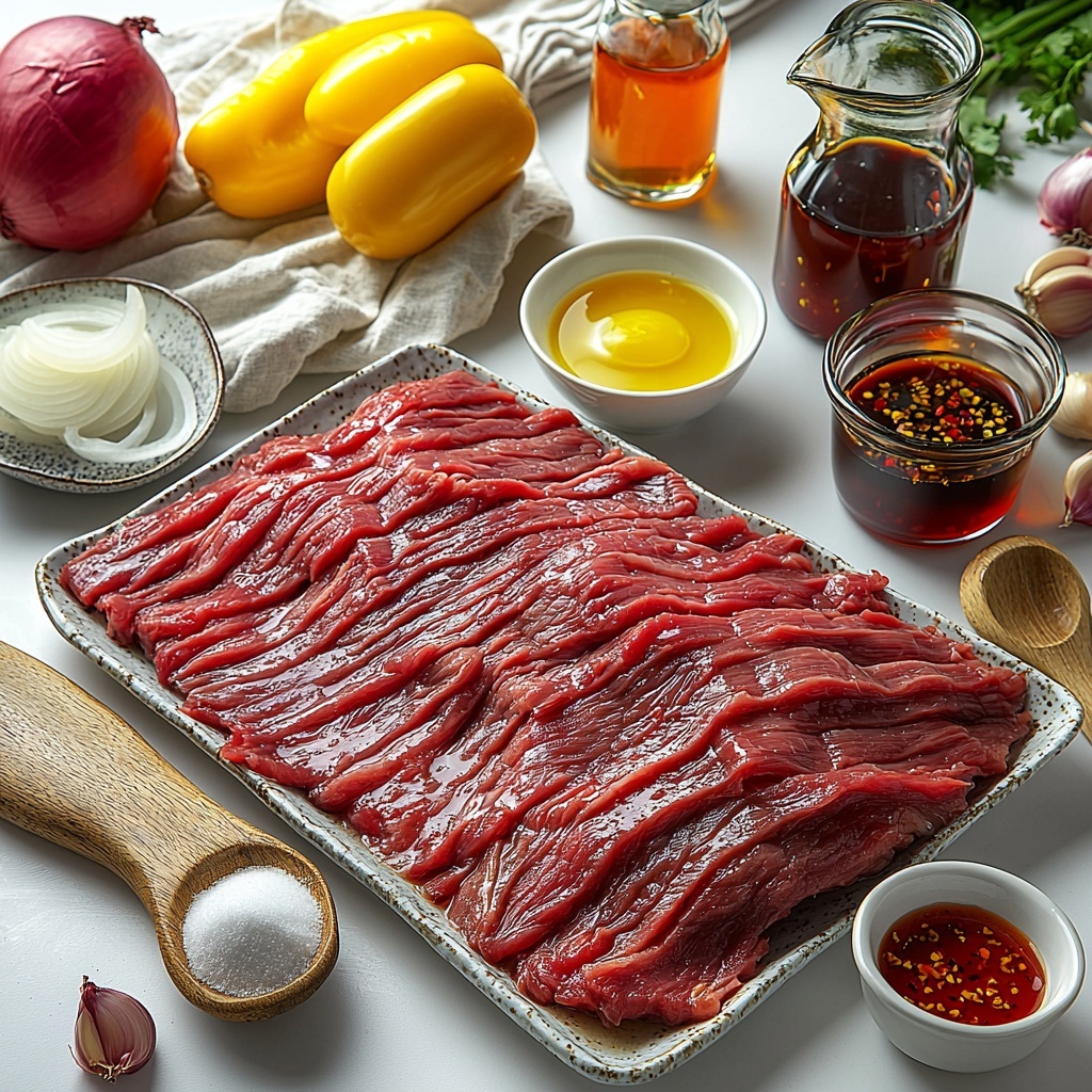 Start by slicing your skirt or flank steak thinly against the grain into ¼-inch strips — this ensures tenderness. Then toss the strips in a bowl with the beaten egg and 1 teaspoon of cornstarch. This simple marinade helps the coating stick and tenderizes the beef slightly. Let it marinate for anywhere from 30 minutes up to one hour if you have the time; this step makes a difference!