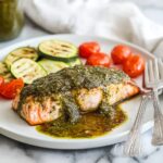 This vibrant pesto salmon recipe features tender salmon fillets coated in a fresh, homemade basil pesto and baked to perfection. The dish combines rich omega-3 fatty acids from the salmon with the bright, aromatic flavors of basil, garlic, pine nuts, and parmesan, making it a healthy yet indulgent meal perfect for any occasion.