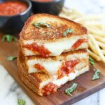 Remove the sandwiches from the skillet and slice them in half. Serve immediately with warm marinara sauce on the side for dipping, elevating every bite with a zesty burst of flavor.