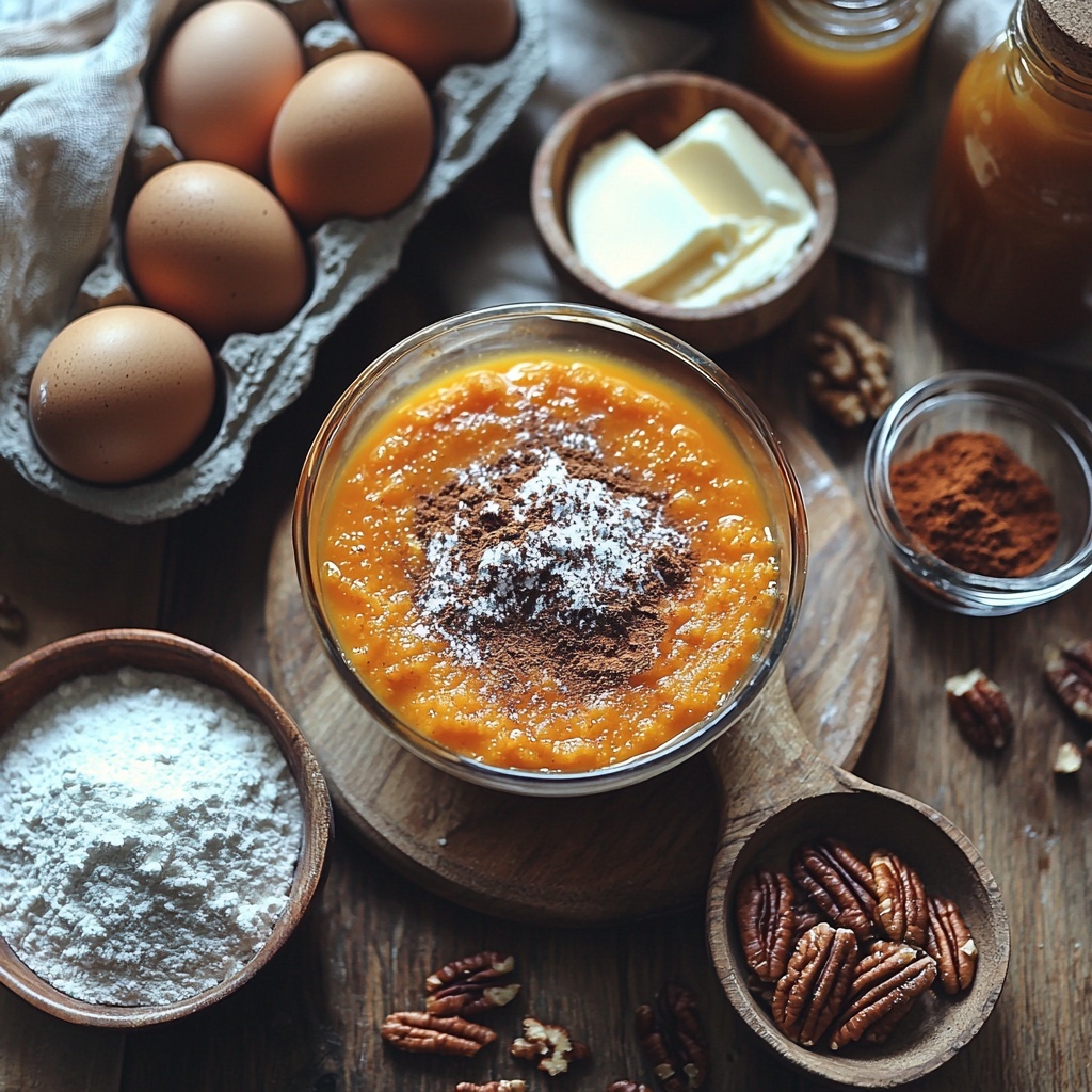 Start by preheating your oven to 350°F (175°C) and greasing your baking pan so this wonderful cake doesn’t stick. In a large bowl, sift together the flour, pumpkin pie spice, baking powder, baking soda, and salt—this ensures each bite is perfectly balanced with just the right amount of spice and lift. In another bowl, beat together the eggs, oil, and granulated sugar until smooth and glossy, then gently fold in the pumpkin puree. Gradually incorporate the dry ingredients until everything is just combined; overmixing can make the cake tough, so keep it light.