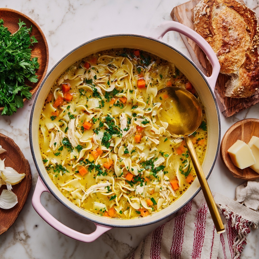 This soup shines beautifully alongside warm, crusty bread slathered with butter or garlic toast for dipping. If you want something lighter, a crisp green side salad with a tangy vinaigrette balances the soup’s richness perfectly. For a more indulgent pairing, a grilled cheese sandwich complements the hearty noodles and chicken brilliantly.