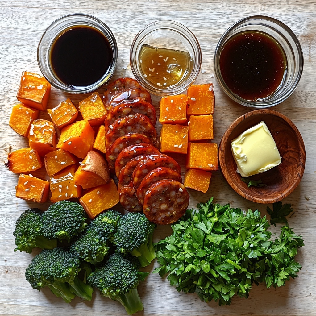 A flavorful and easy one-pan meal featuring sliced chicken or turkey sausage, roasted sweet potatoes, and broccoli florets, all coated in a sweet and savory honey garlic sauce. This wholesome sheet pan dinner comes together quickly and is perfect for busy weeknights.