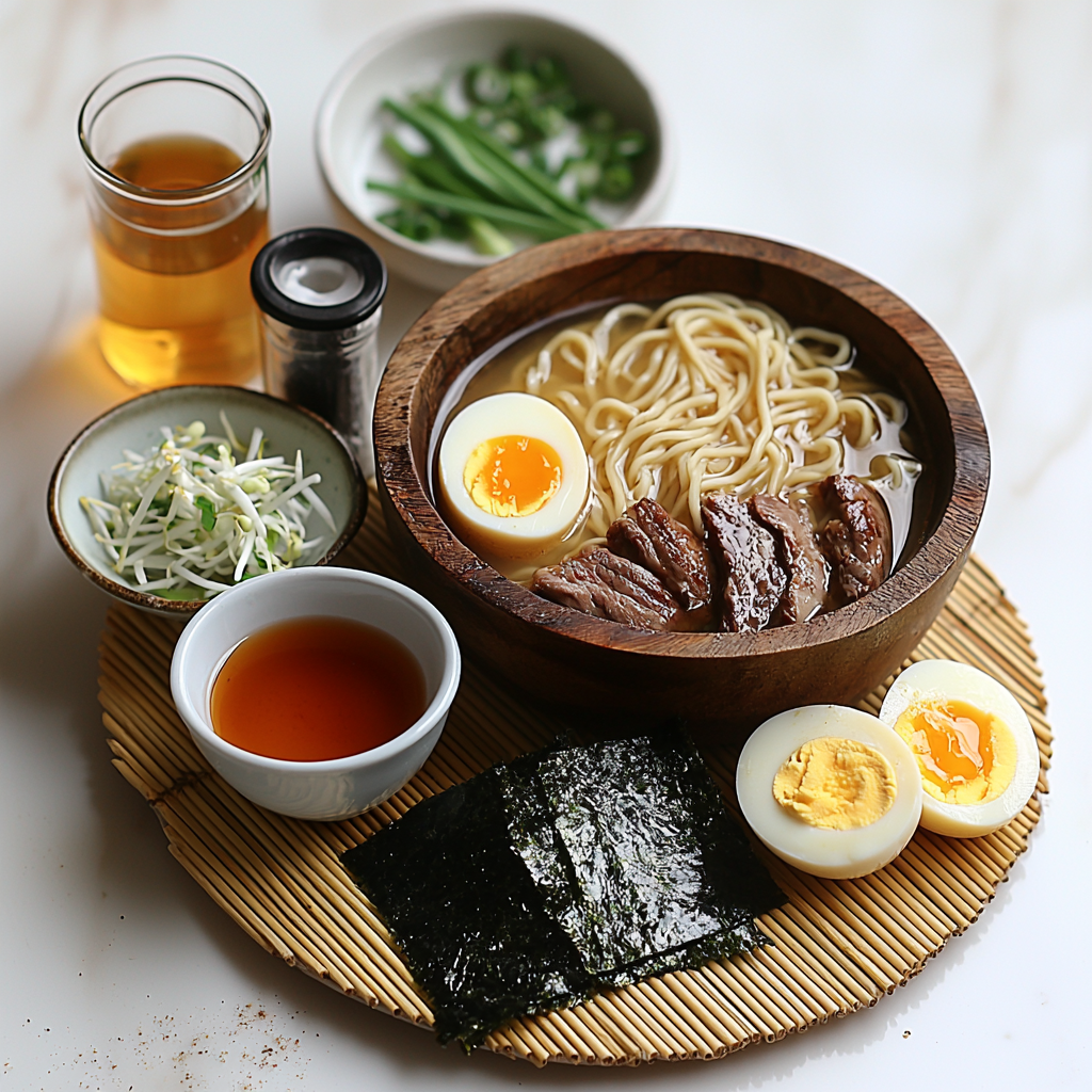 Garnishes elevate your bowl both visually and in taste. Soft-boiled eggs with their creamy yolk add richness, while thinly sliced green onions bring brightness and crunch. Nori strips offer a gentle ocean aroma and a silky texture that pairs perfectly with the broth. Feel free to add a sprinkle of toasted sesame seeds or a bit of chili oil if you want an extra kick.