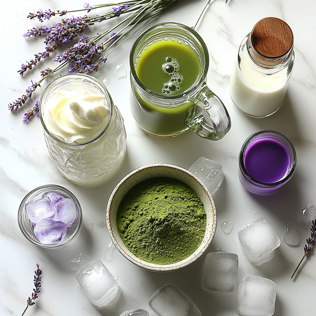 Every ingredient here plays a key role in delivering the perfect balance of flavors and textures, from the vivid green matcha powder to the creamy oat milk base and the aromatic lavender foam. These components are simple yet thoughtfully selected to create a harmonious drink that delights both the eyes and the palate.