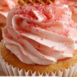 - Frost and Add Crunchy Topping: Once cooled, generously spread the strawberry frosting on each cupcake and sprinkle with crushed strawberry wafers for added texture and flavor.