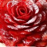 - Create the Strawberry Rose: Arrange the thinly sliced strawberries on top in concentric circles, starting from the outer edge and overlapping the slices to form a rose-like pattern.