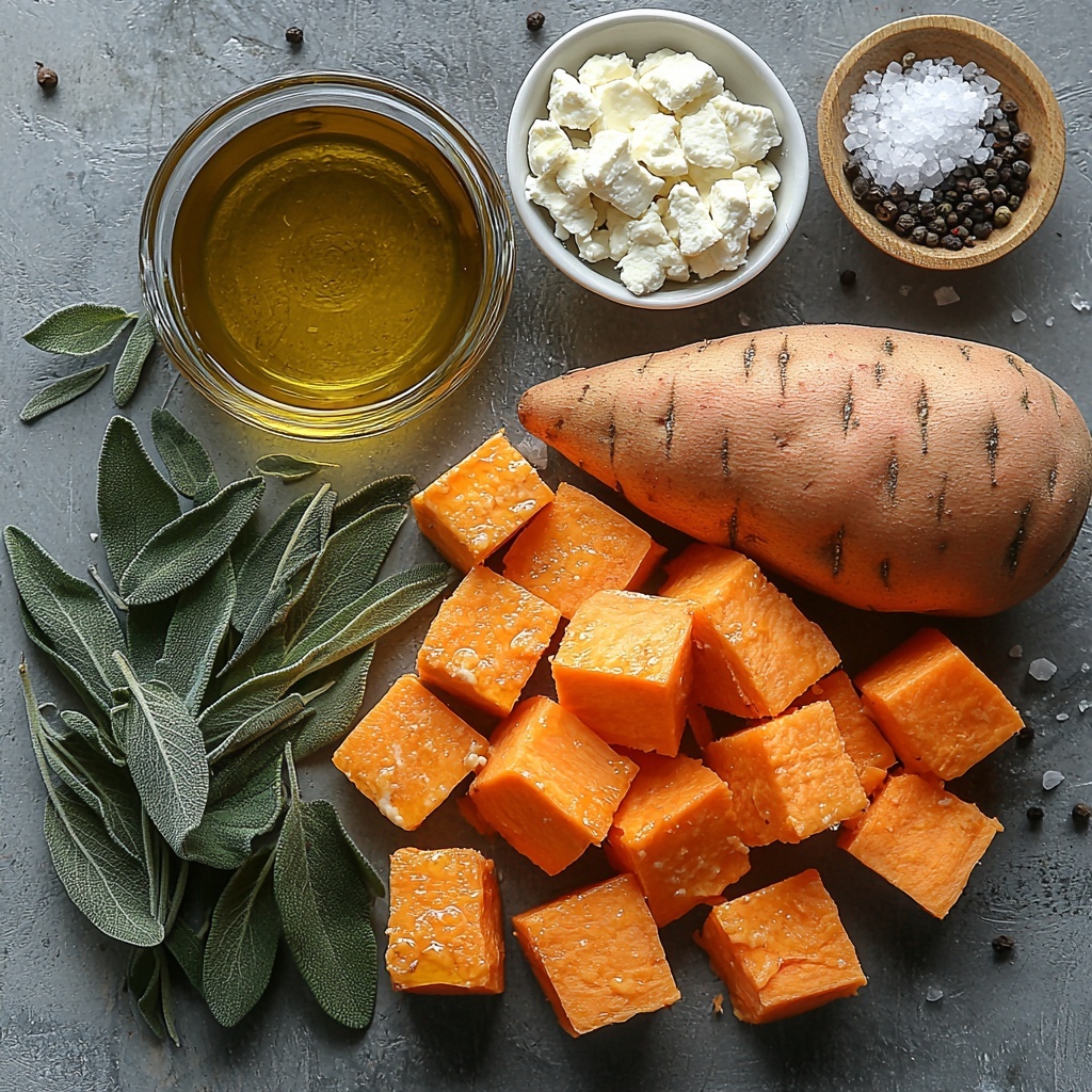 This Sweet Potato Goat Cheese Sage recipe is a delightful side dish featuring roasted sweet potatoes tossed in olive oil, salt, and pepper, then topped with creamy goat cheese and crispy fried sage leaves. The dish combines earthy, sweet, and savory flavors with a crisp texture contrast, making it a perfect accompaniment to any meal.
