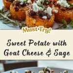 Transfer the roasted sweet potatoes to a serving dish while they’re still hot. Crumble the goat cheese evenly over the top so it gently softens, then scatter the crispy sage leaves for a perfectly balanced finish. Serve immediately for the best texture and flavor experience.