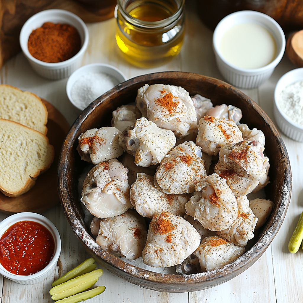 These ingredients might seem straightforward, but each plays a crucial role in delivering the iconic taste, texture, and vibrant color that make this recipe stand out. From the tangy buttermilk soak to the fiery cayenne in both the dredge and hot paste, every component is essential to capturing that true Nashville flavor.