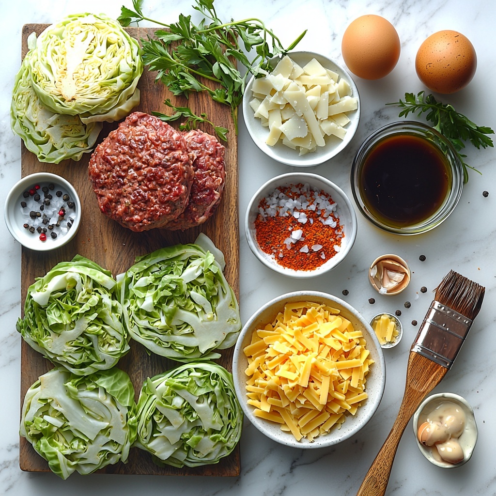 Gathering simple but essential ingredients is the first step to creating these mouthwatering cabbage burgers. Each item plays a key role: from the crisp cabbage rounds adding a fresh crunch, to the well-seasoned meat patty delivering savory comfort, and lastly, the cheese that melts into pure indulgence.